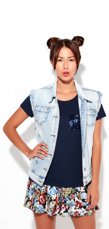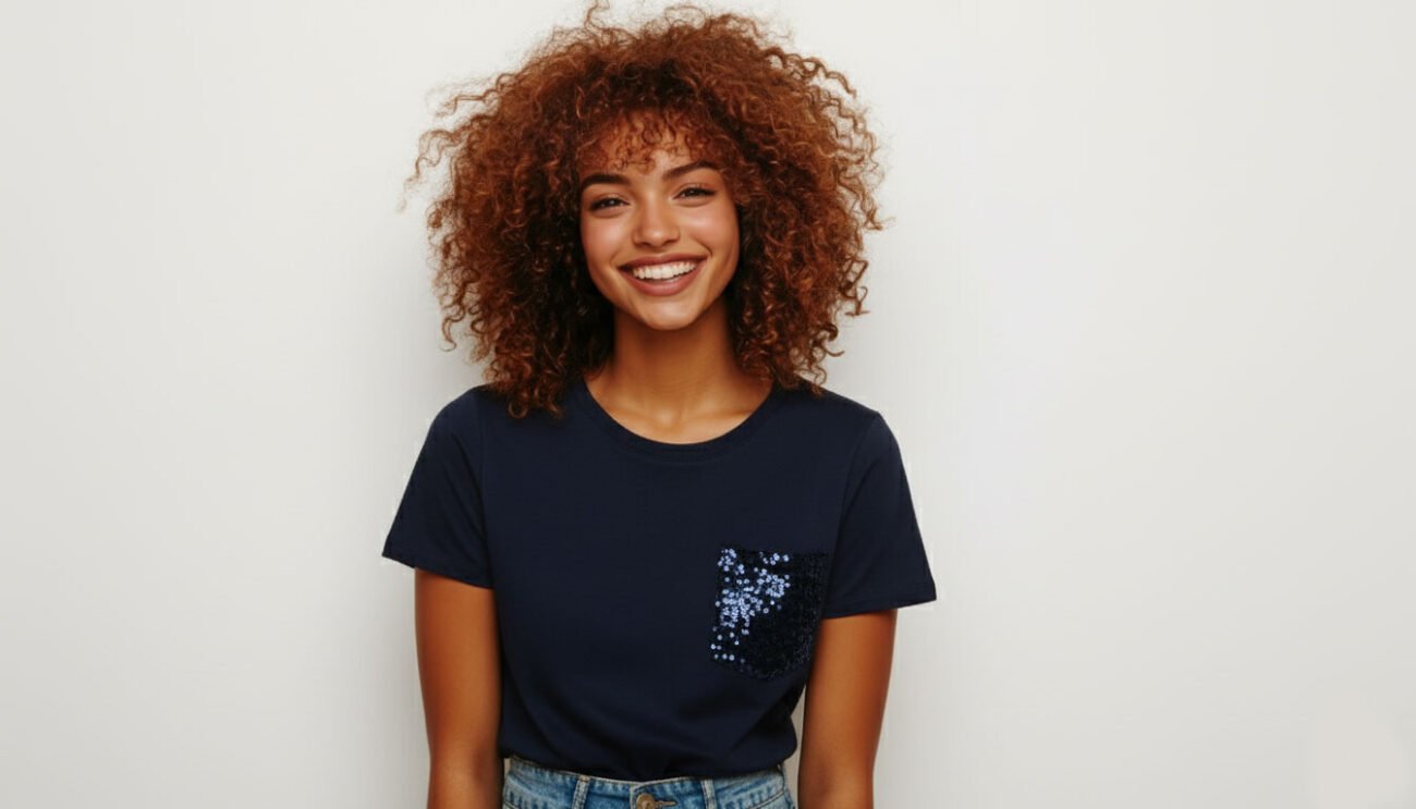 Tshirt de Algodón Azul con Bolsillo de Lentejuelas